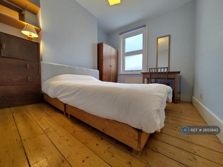 1st Double Bedroom 4.1x2.7m Double Glazed sash Bay window, sanded wood floor, double bed, bay window, two wardrobes, desk, chest of drawers.