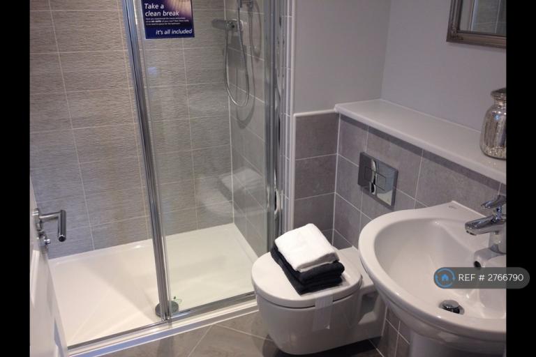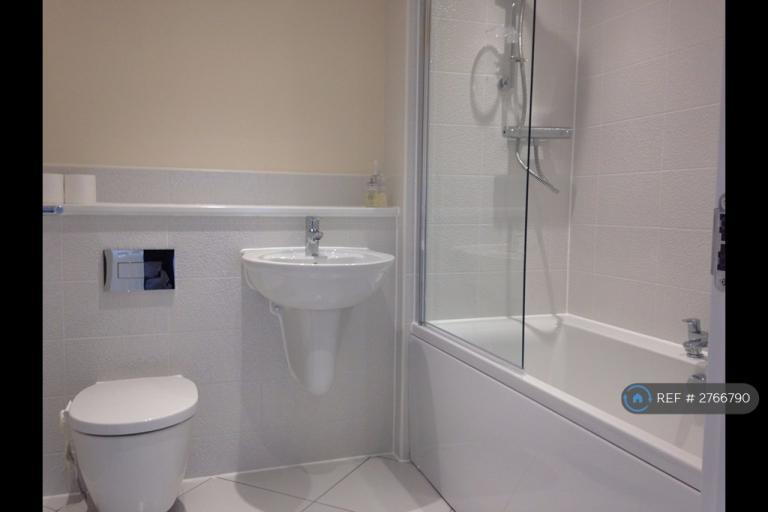 * Bathroom with shower over bath, full height tiling & shower screen.