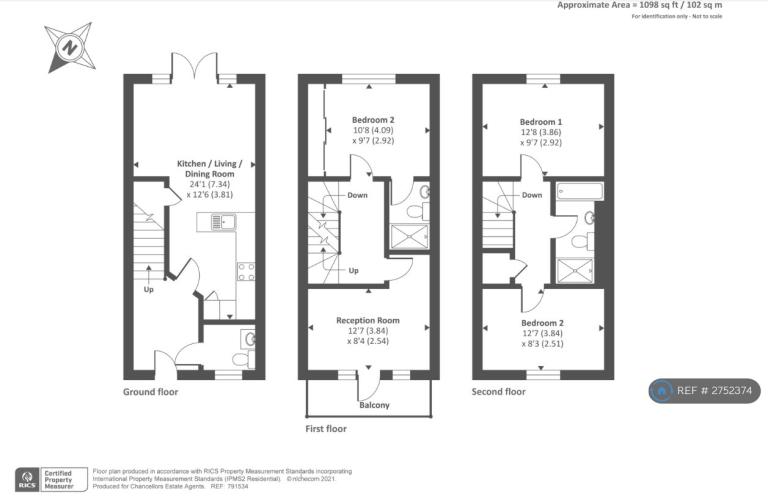 The accommodation is arranged over three floors. On the ground floor, there is a spacious open-plan living area with a well-equipped kitchen and a convenient cloakroom. The first floor offers a generous bedroom with an en-suite and built-in storage, along with a versatile additional room that opens onto a private balcony. The second floor comprises two further bedrooms and a contemporary family bathroom.