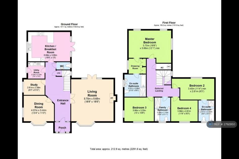 The ground floor is centred around a large entrance hall leading to a well-proportioned kitchen/breakfast room, separate dining room, spacious living room, study, utility room and downstairs WC.