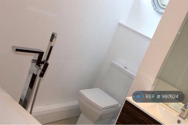 LUXURY FAMILY BATHROOM 11'8" max x 6' 2"Fitted with a contemporary large square free-standing bath with a floor mounted columb mixer tap ,vanity washbasin ,chrome towel radiator, mechanical ventilation, double glazed  window to side, down lighting ,w.c and cream polished porcelain floor tiles. EN-SUITE TWO