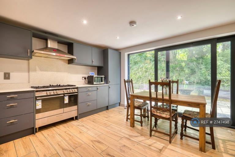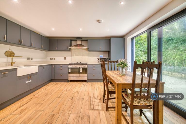 The kitchen is both beautiful and highly functional, finished with white quartz worktops and abundant preparation space. Contemporary units are paired with a Belfast sink, integrated Neff appliances, and a Fisher & Paykel Rangemaster with double and single ovens â perfect for slow weekend cooking or lively gatherings. Feature angled glazing draws in natural light and frames the surrounding greenery, while French doors open onto the rear terrace, inviting the outdoors in.