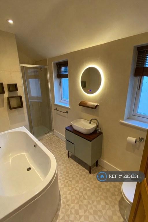 The first floor comprises a main bathroom and three bedrooms: a generous double with fitted wardrobes, a smaller double, and a spacious single. The bathroom features a double-ended bath with shower head, a large walk-in shower cubicle, and a modern vanity unit with illuminated mirror.