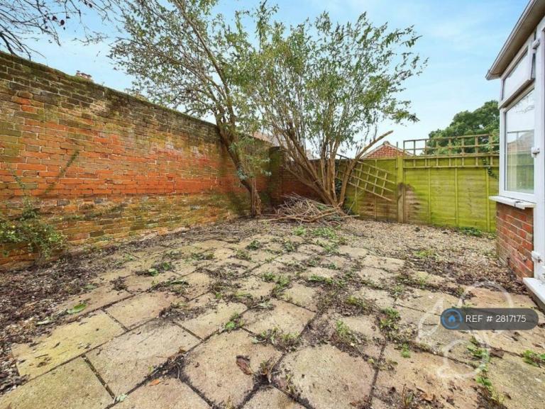 - Private rear garden with paved patio area and mature tree
