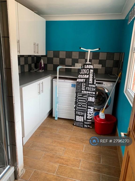 Utility/shower room, including washing machine, under the counter freezer, iron & ironing board, clothes airer.Â
