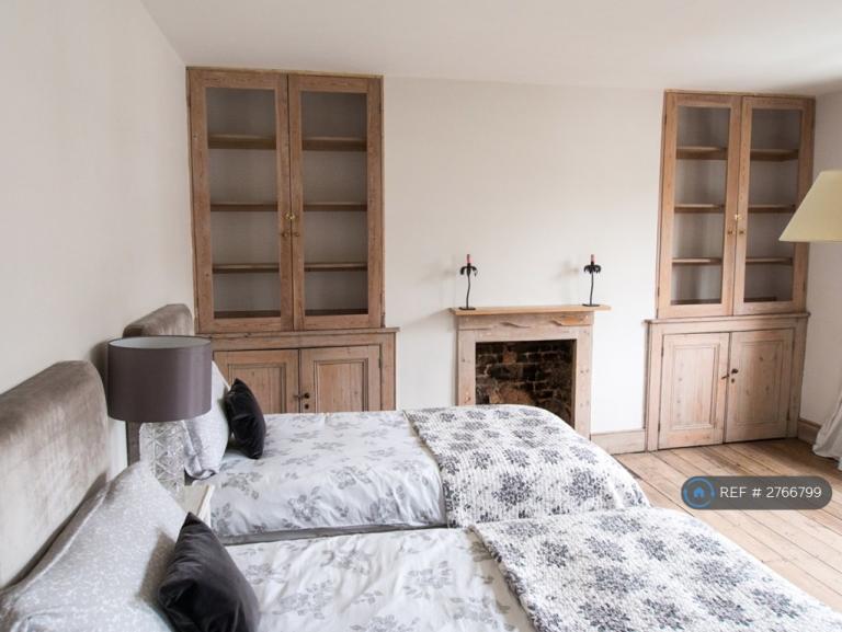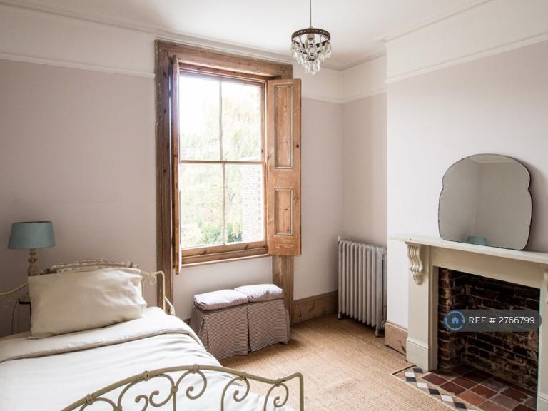 Bedroom 4 double with views over street, built in cupboards space. Victorian wood fireplace. Pale pine wood floor.