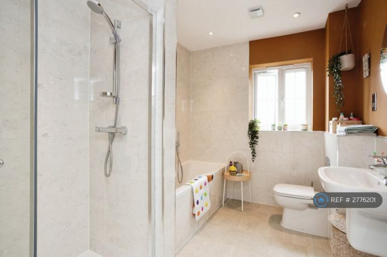 BATHROOM A stylish contemporary bathroom with white suite comprising shower cubicle; bath with mixer tap and hand-held shower attachment; WC; wash basin and heated towel rail.