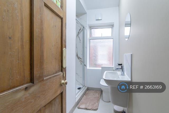 Frosted window to the side. Wall mounted combi boiler. Plumbing for washing machine. Tiled floor.