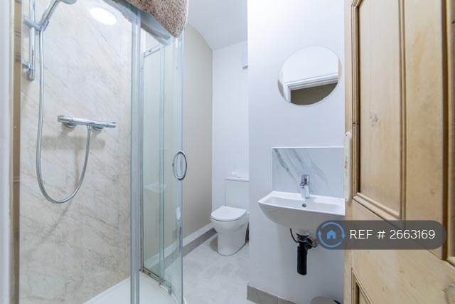 Sash window to the side. White suite comprising low level WC, pedestal wash hand basin, panelled bath and shower cubicle. Tiled floor and tiled walls. Radiator.