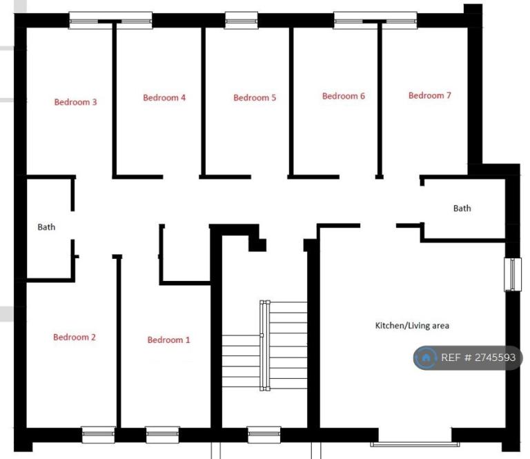 This 7-bedroom flat is on the 2nd floor, and benefits from a Juliet-style balcony in the open plan kitchen / lounge area, providing the space with great natural lighting.