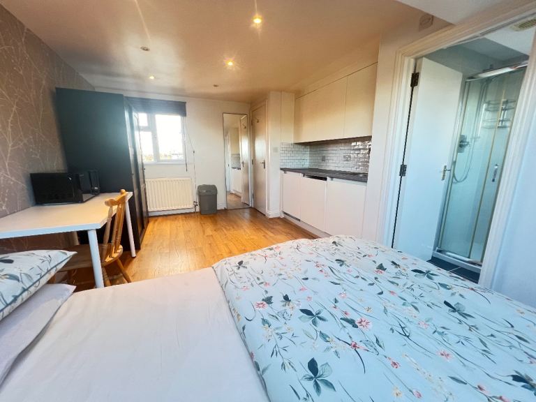 Spacious and bright, open plan sleeping and living area, fully fitted brand new kitchen with wm, cooker/oven, ff, gch, en-suite shower/wc.