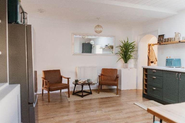 At the end of the kitchen/dining area, there are two easy chairs and a coffee table, providing additional seating in what is ‘the hub’ of the apartment.