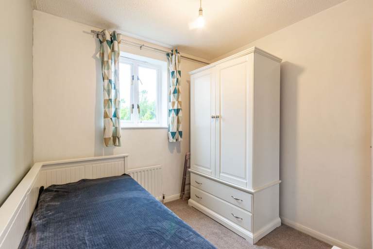 ~Second, smaller bedroom with “day-bed”, large storage wardrobe and carpeted flooring