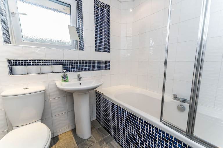 ~Stylish bathroom with three-piece suite including shower over bath