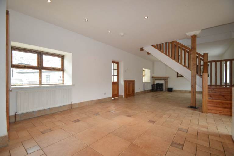 Open plan lounge / dinner with log burning stove and feature solid oak stair case.