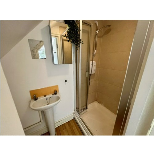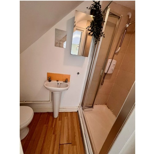 Separate bathroom with a shower, WC and wash-hand basin.
