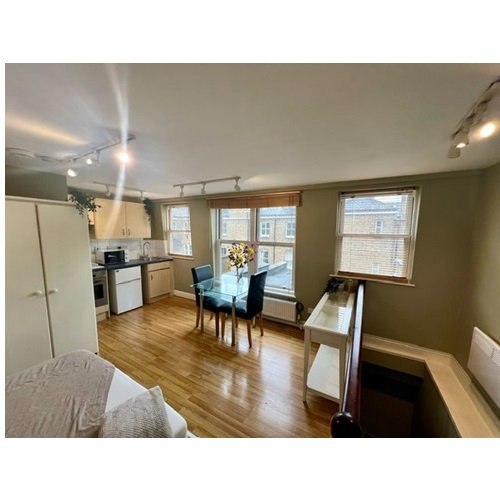 Light and spacious studio room with three sash windows plus a Velux skylight providing lots of natural light and ample ventilation, wooden floors and neutral decor.