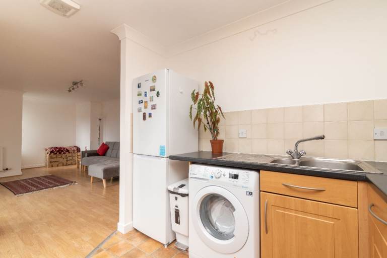 Bright open-plan lounge and kitchen area with good natural light