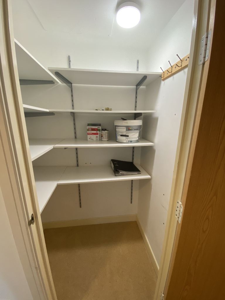 Contemporary kitchen in gloss white with oak worktops. Neff gas hob with wok burner and extractor. Fan assisted oven. All stainless steel. 1 1/2 bowl sink with Hans Grohe shower tap. Integrated fridge/ freezer, dishwasher and new LG washer/ dryer. Substantial storage in both kitchen and large shelved hall cupboard.