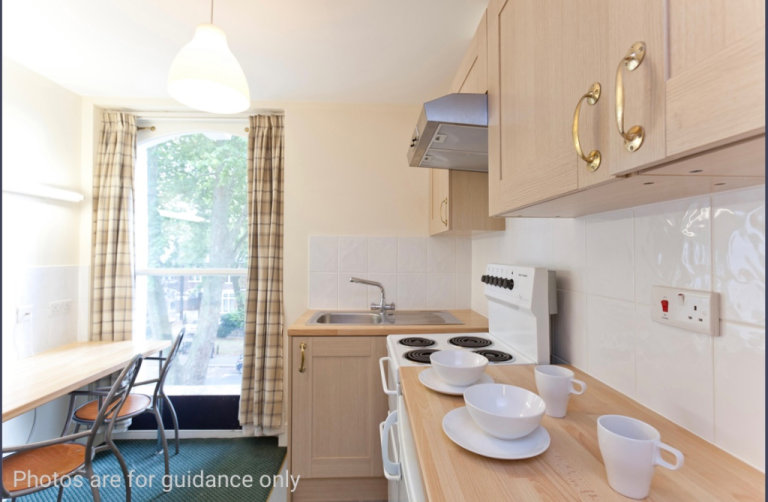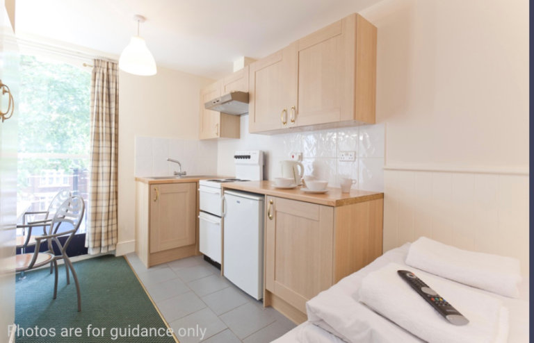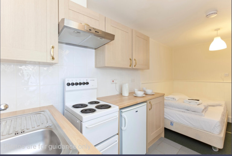 The studio combines a double bed, en suite bathroom and fully equipped kitchen.