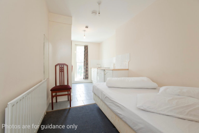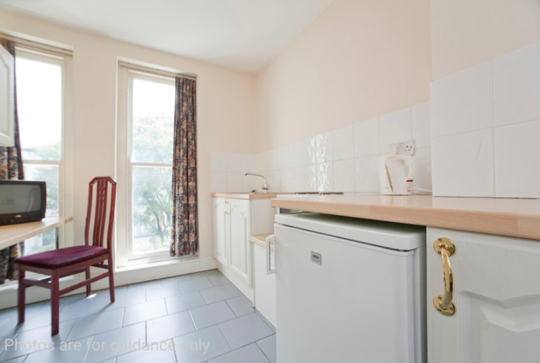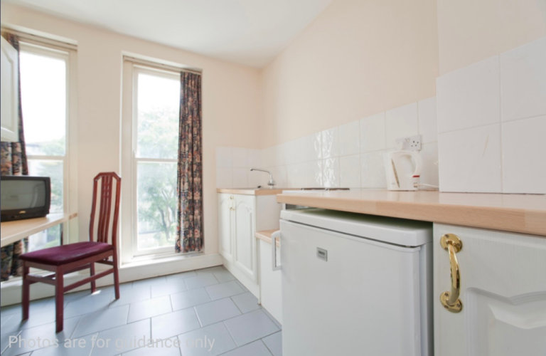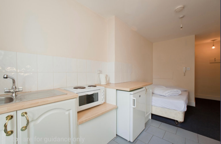 The studio combines a double bed, en suite bathroom and fully equipped kitchen.