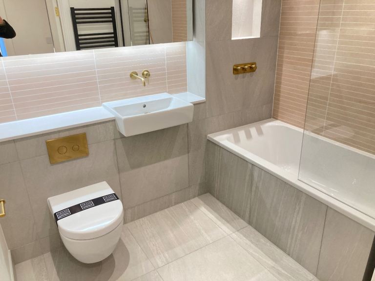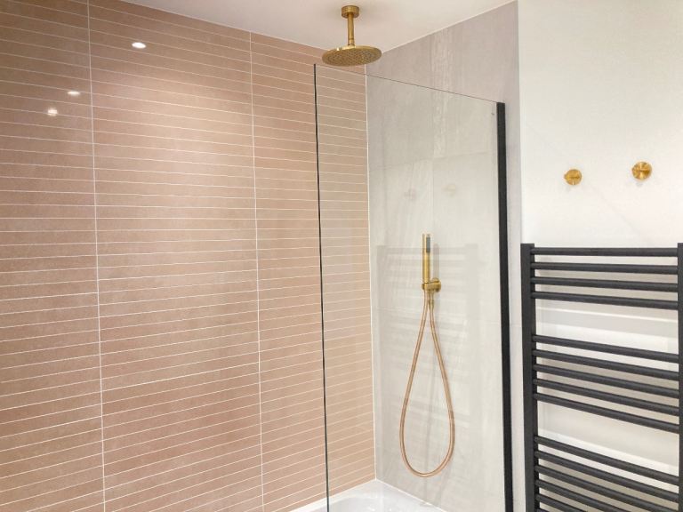 Separate Large Luxury Shower Room Large Rain Hand Shower Tray, Basin Mixer Taps, Low Level WC, Heated Towel Rail, Vanity Mirror, Storage Shelves, Power Points