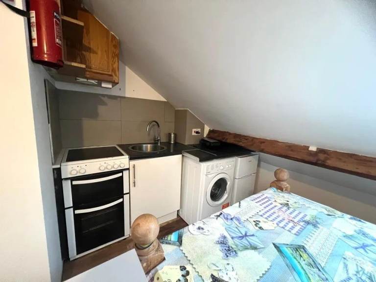 Kitchen Essentials: Features an electric hob, washing machine, and mini fridge (Note: This is an electric-only property with no gas supply).