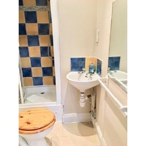Private en-suite bathroom with a shower, wash-basin and WC.