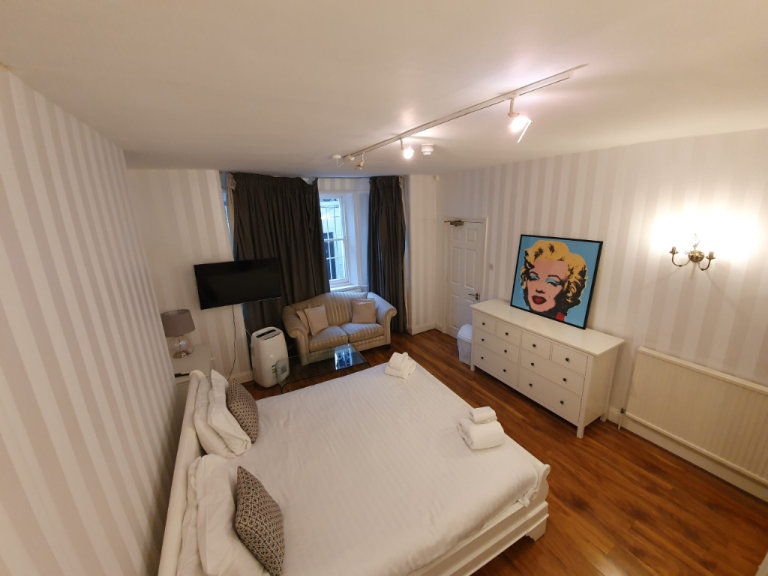 Double studio room with lots of natural light and furnished with a sofa, leather easy chairs, coffee table, dining table and chairs, double bed, double wardrobe, two chests of drawers.