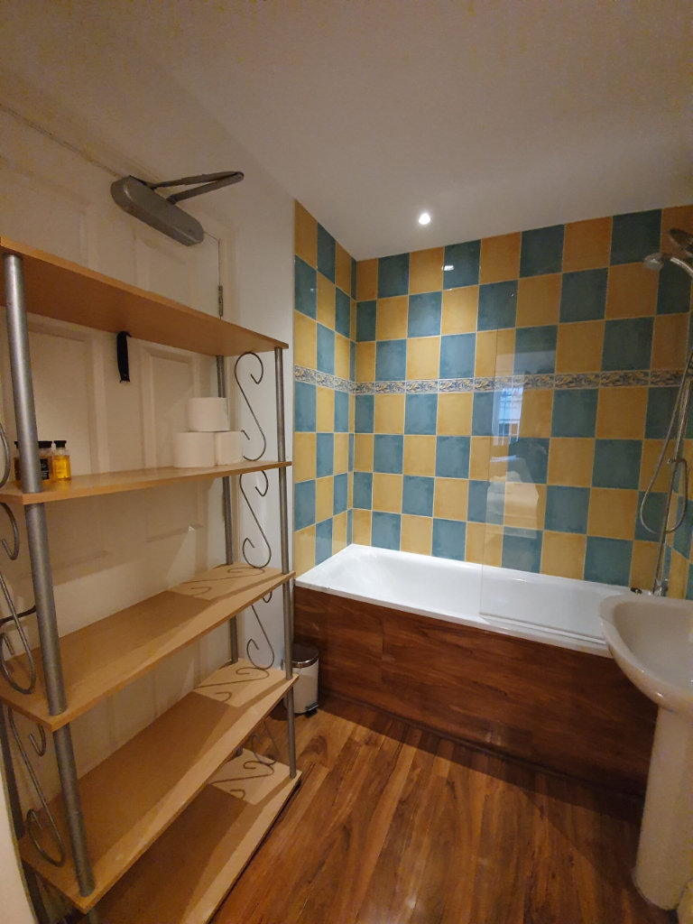 Private bathroom with a bath with overhead power shower, WC and wash-basin.