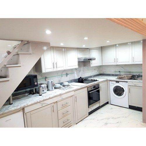 Newly refurbished fully fitted kitchen with marble work-tops and splash-back, a range of wall and base units, built-in counter top four ringed hob, oven, fridge/freezer and washing machine.