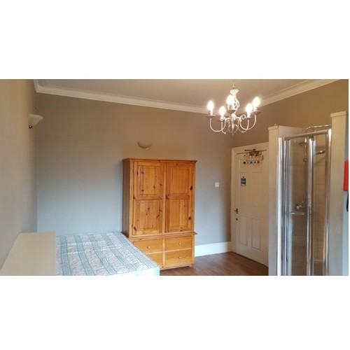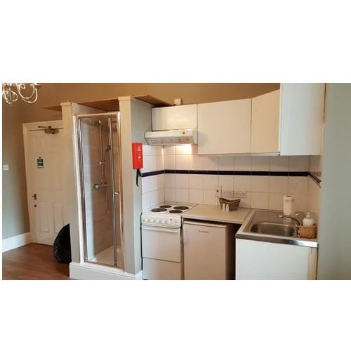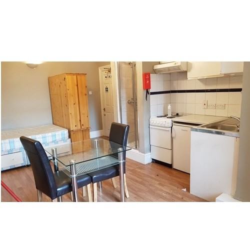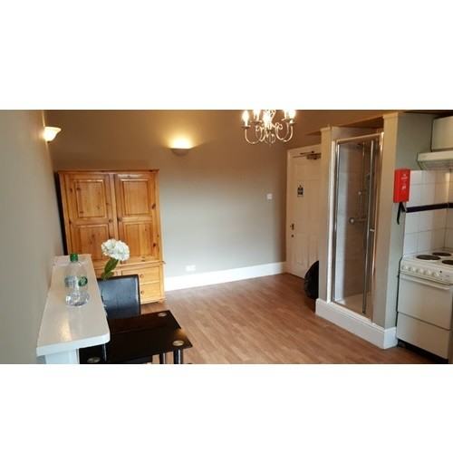 Newly decorated modern studio room with a sash window providing lots of natural light and ventilation, high ceilings and new wooden floors fitted throughout. Furnished with a double bed, dining table and chairs, wardrobe.