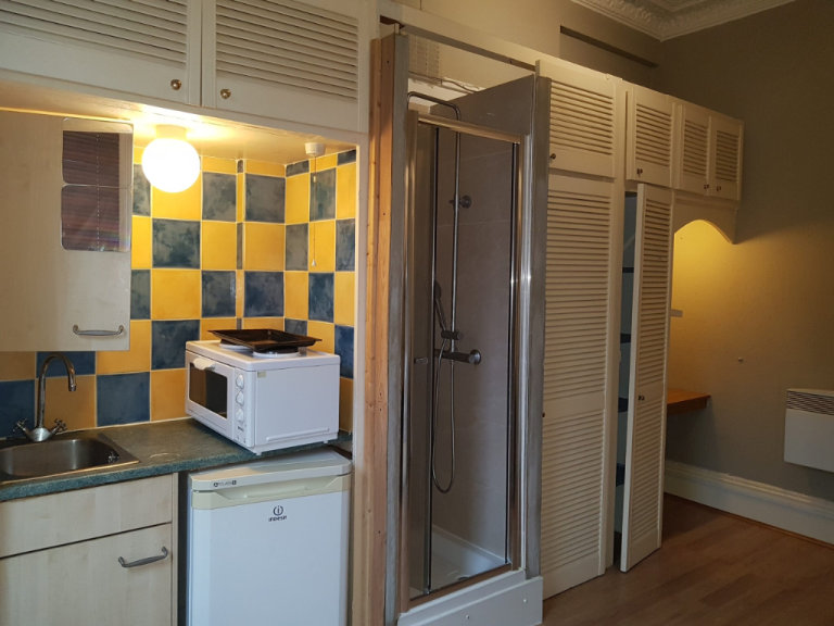 A larger than average double semi-studio situated within a large Victorian house. Situated in-between West Kensington and Barons Court stations with lots of amenities in the area. Fully furnished, own kitchenette, private shower & shared WC.
