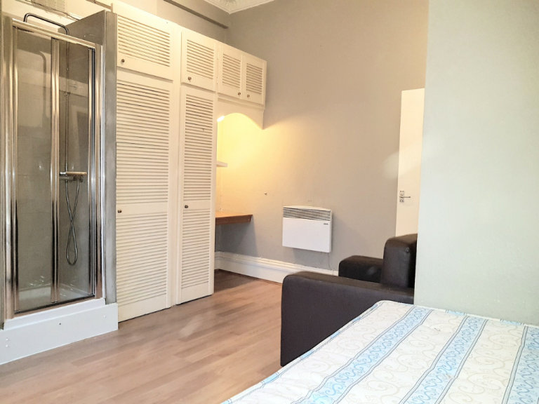 Large bright double flat with a huge bay window providing lots of natural light and ventilation. Furnished with a double bed, built-in wardrobes, chest of drawers, small table and chairs.