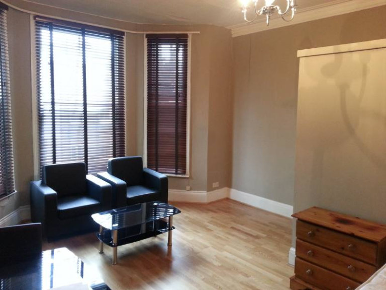 Double studio room with a large full height bay window providing lots of natural light and ventilation.