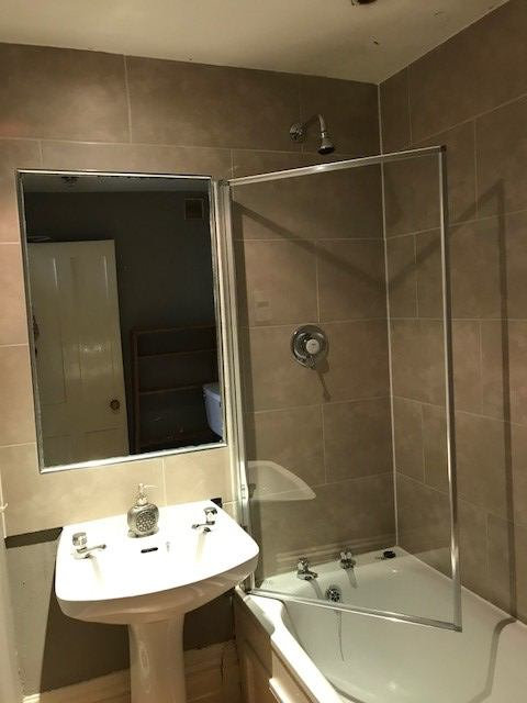 Private en-suite bathroom with bath with over-head shower, shower and wash-basin.