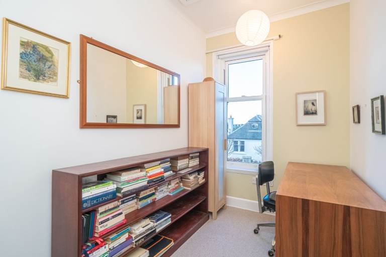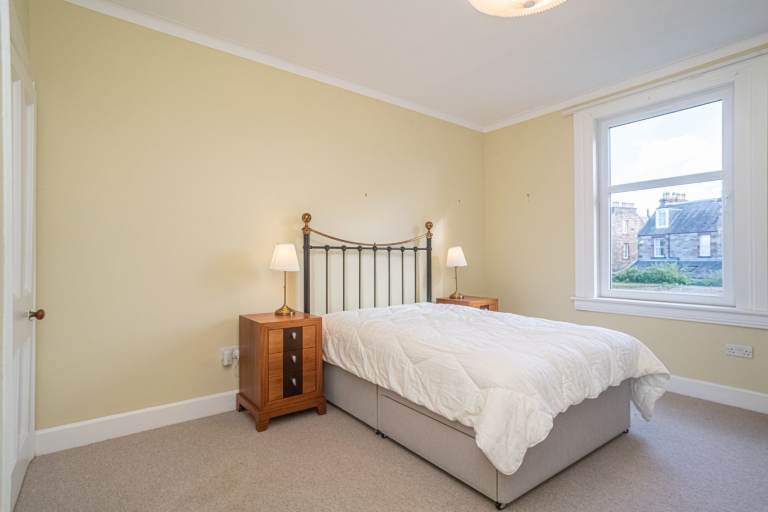 Exceptionally well presented bright and spacious three-bedroom upper villa situated in the much sought after residential area of Trinity. The property is an original purpose-built upper villa with an open outlook to the front, facing west and having a sunny area of private garden situated to the rear making a lovely a family home. The comfortable accommodation is accessed by a private entrance pathway, comprising – entrance vestibule; hall with a door also leads to a passageway giving access to the rear garden, first floor landing with storage cupboards, sitting room with large west facing bay window and a shelved walk in cupboard, dining room situated to the rear overlooking the private garden, modern fitted kitchen with appliances, up to the minute tiled shower-room with water-fall shower, large spacious double bedroom with double aspect windows, further second double bedroom with press cupboard to the rear, and bedroom three ideal for home office / study. Garden to the rear of the property is a sunny area which has been landscaped with areas of patio and lawn.