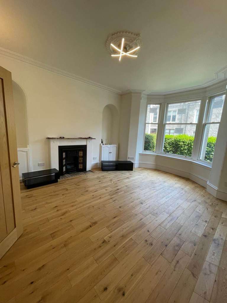 Large lounge with bay window, non functional open fireplace. Storage cupboards on either side of the fireplace.