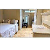 Large double studio room furnished with a table and chairs and two double wardrobes.