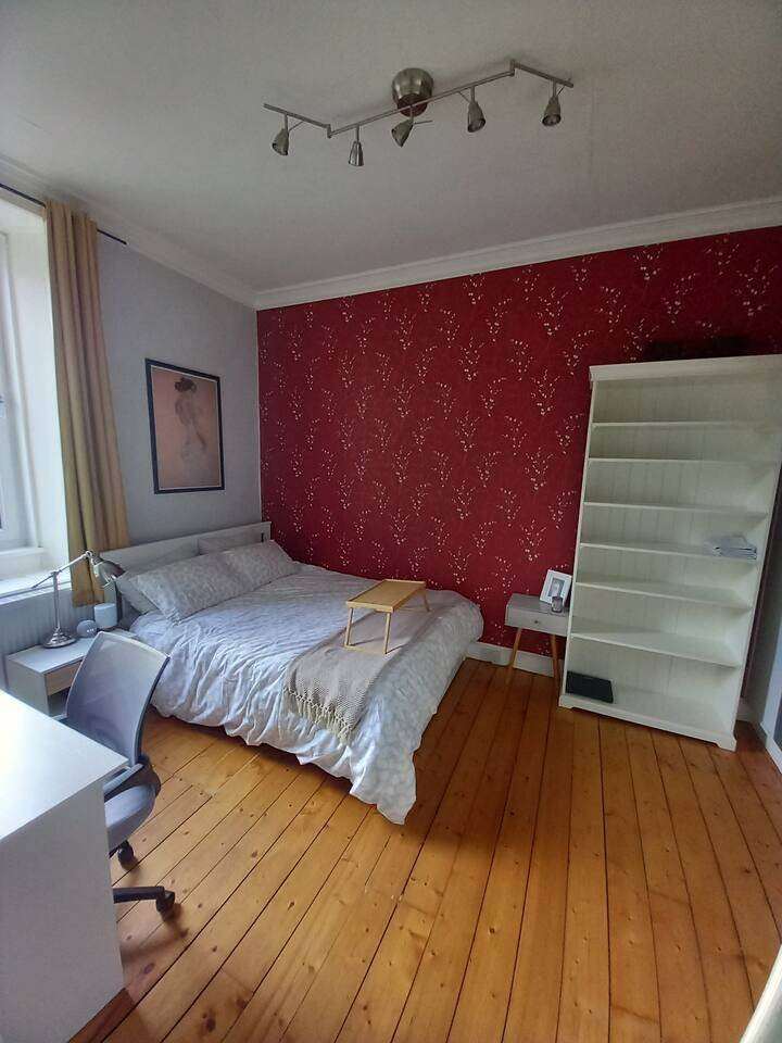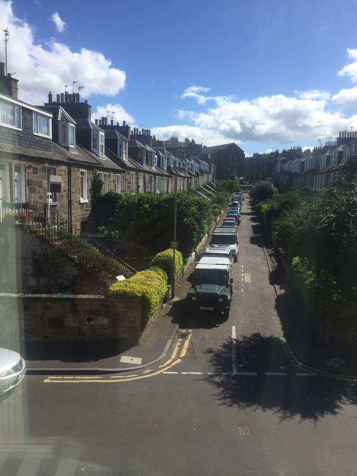 5 mins by bus from city centre and 2 min walk from shops and bus stop but off the main road so quiet and peaceful area.