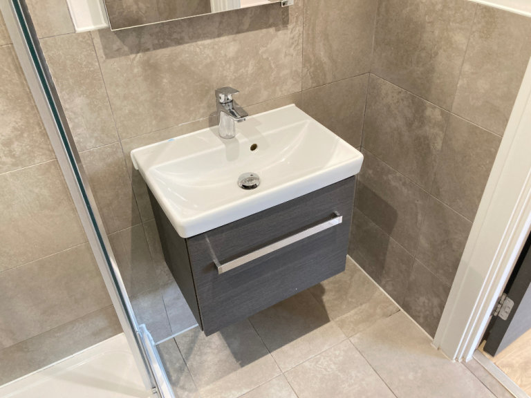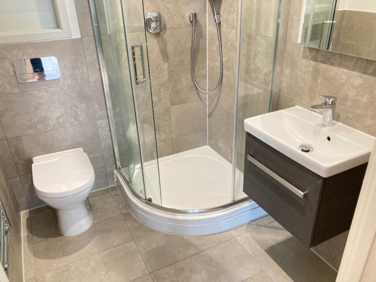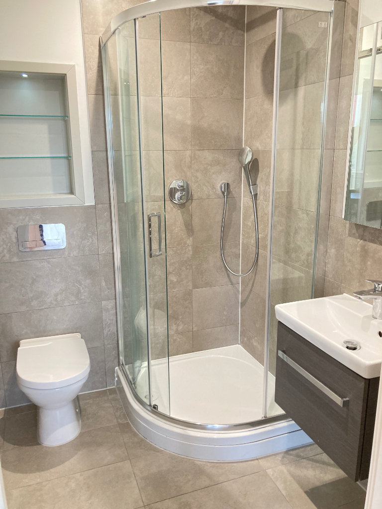 Separate Ceramic Floor and Wall Tiled Full Shower Room Suite, Corner Shower Rain Shower and Hand Shower, Basin Mixer Taps, Vanity Storage Unit, Shaver Points, Heated Towel Rail