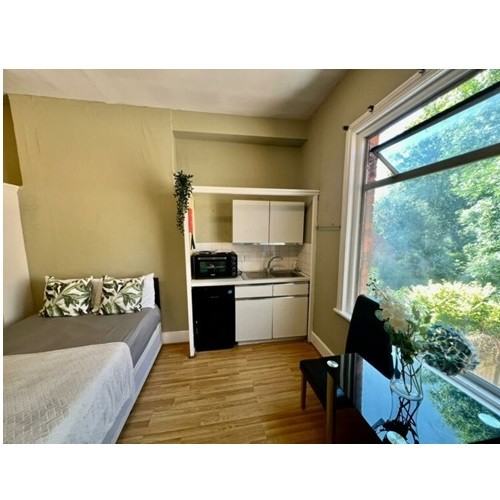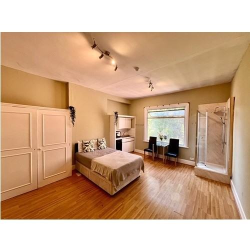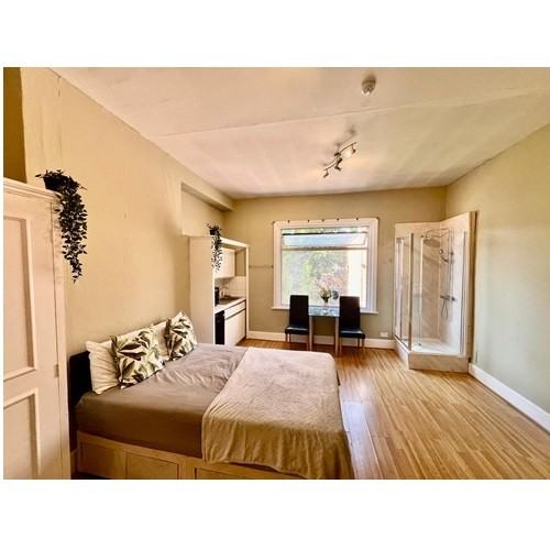 Studio room situated within a large Victorian house. Fully furnished with a double bed, dining table and chairs, double fitted wardrobe, chest of drawers and shelving.