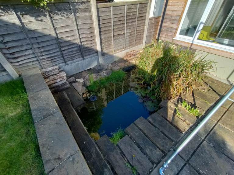1 offroad parking spot with roadside parking infront also. Back garden with BBQ area, grass, small veg patch, wild grass area, pond and log store. Small but private and a nice place to unwind on summer evenings.