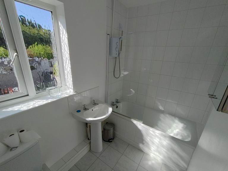 Main bathroom with bath and electric shower, heated towel rail.