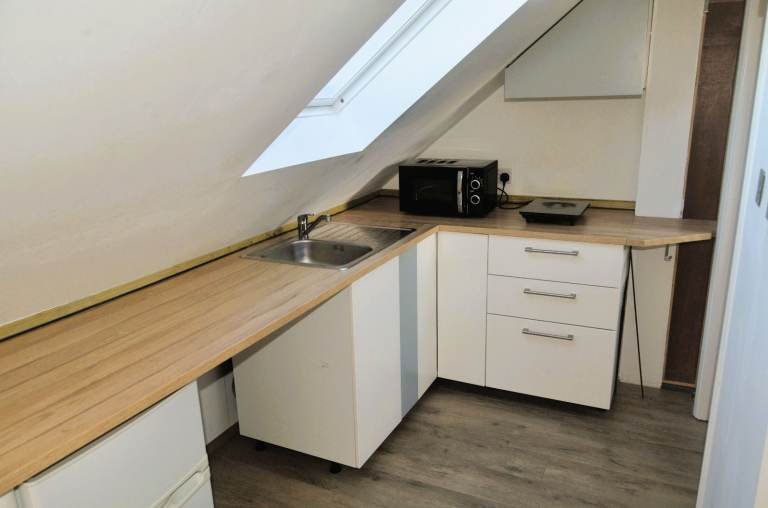 A clean and practical kitchenette designed for modern living, equipped with an induction hob, microwave, and under-counter fridge/freezer. Perfect for everyday meals and light cooking.