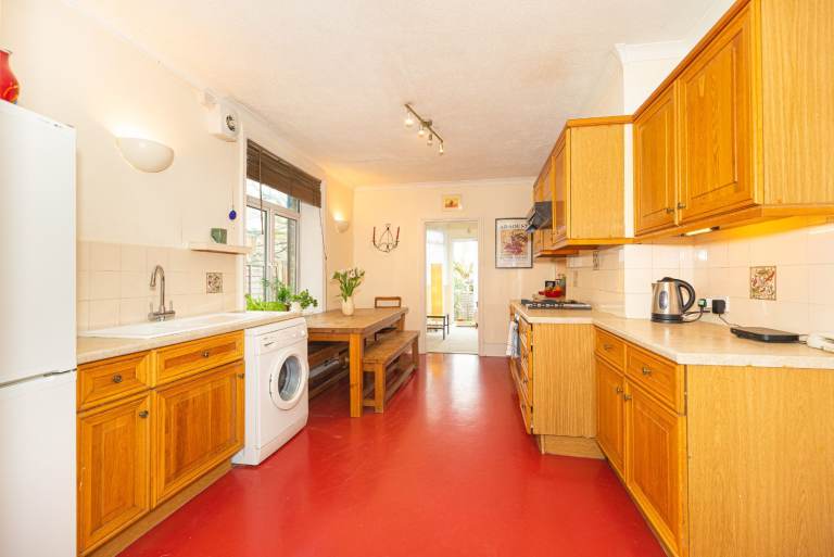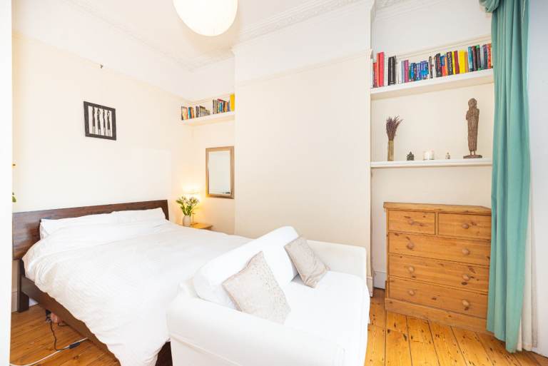 Both wooden floored bedrooms contain a king-size bed, a wardrobe, drawers, and shelves. There's a large, fully equipped galley kitchen, lounge, bathroom, a sunny little garden, and a large storage basement. It's the ground-floor flat of a Victorian house.