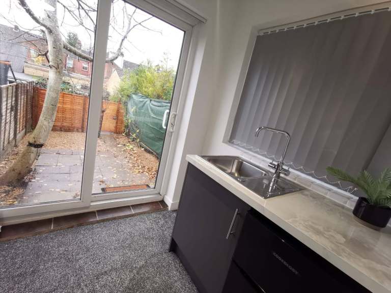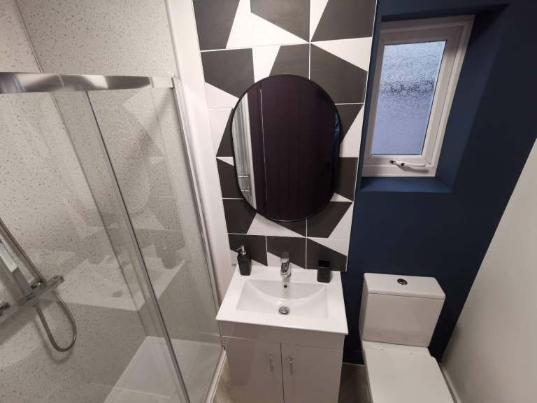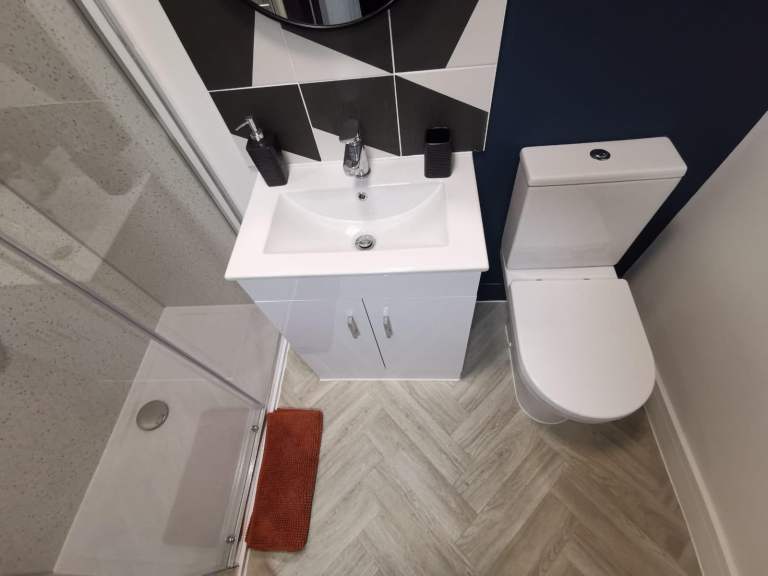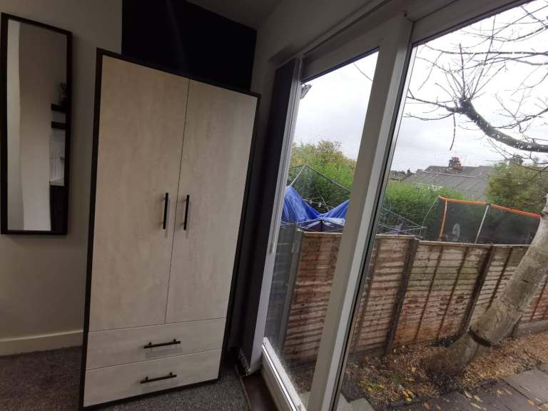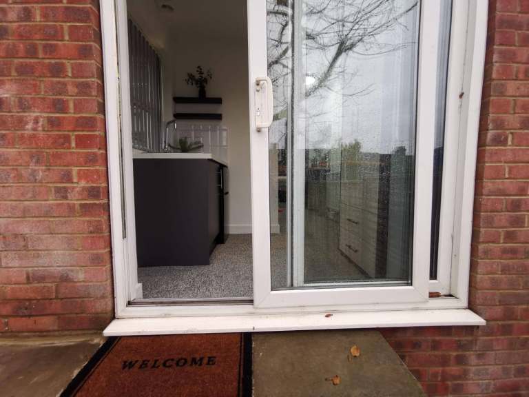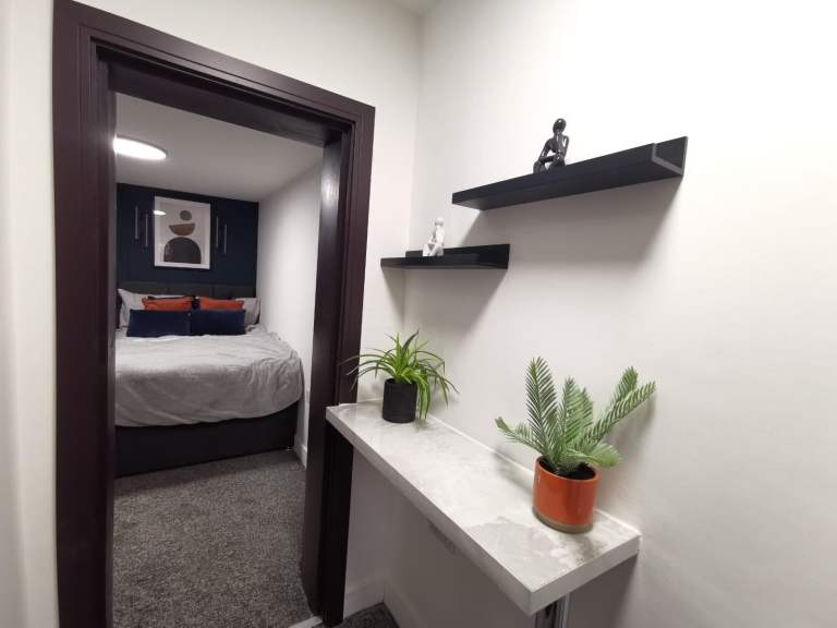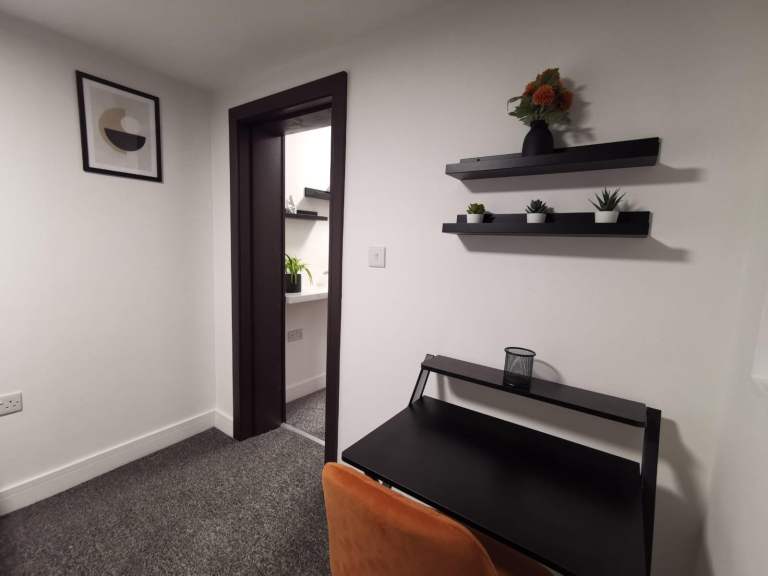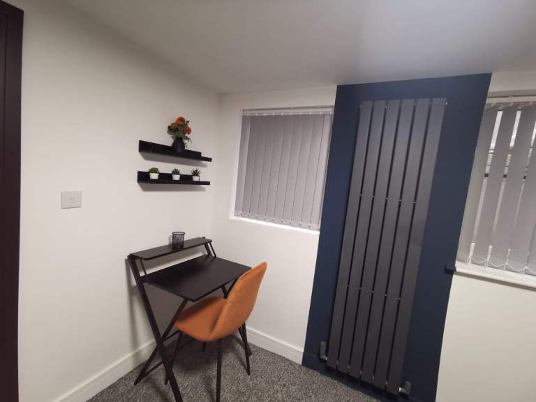 Modern ground floor studio in Luton. Fully furnished with kitchenette, ensuite, workspace & small porch area.