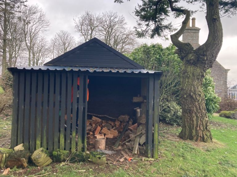 Outside: small wooden garage with log store, private driveway and parking.