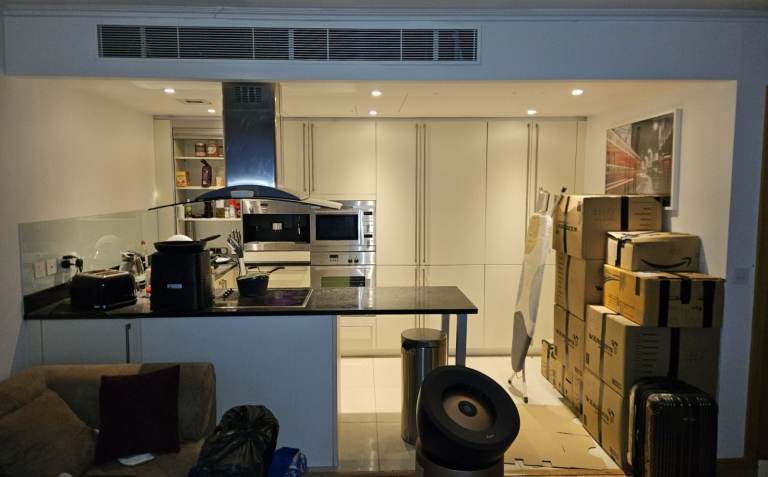 Photos show the flat during packing ahead of move-out.