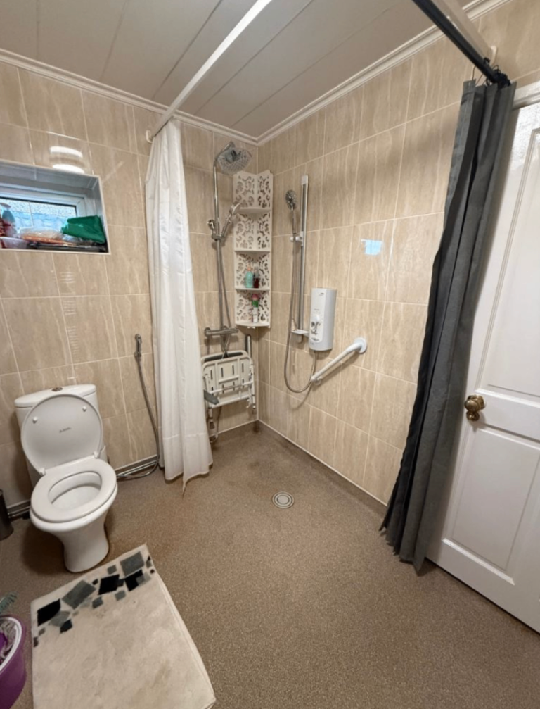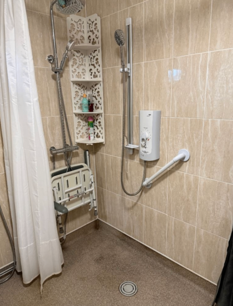 • Modern accessible wet room with disability access, grab bars & roll-in shower